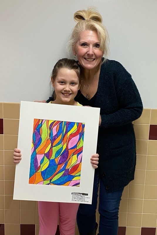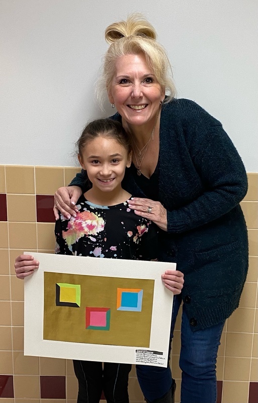 Kayla Beazley, a 5th-grade PBC student who has been a student of Ms. Chriss’s for six years, used Mixed Media of watercolor, tissue paper, pipe cleaners, and construction paper to create her artwork for the exhibition. Her mosaic-like work was inspired by Alvin Loving, New Morning I. Eva Pasquini, a PBC 4th grader, used brilliant, stunning color in her Mixed Media of crayon and Sharpie marker in her adaptation idea that was inspired by Alvin Loving, New Morning I. She is excited to have her artwork displayed in the exhibition!