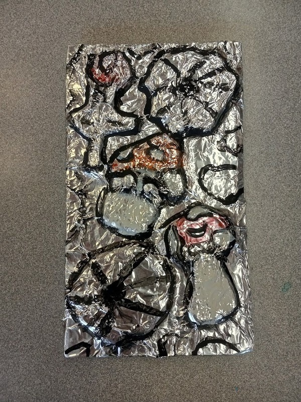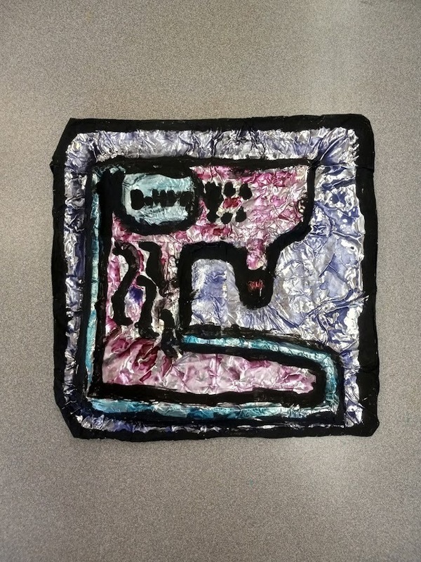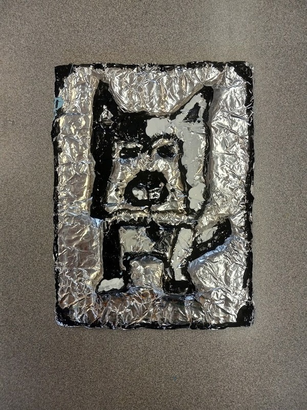 Sophia Polec, a 4th grade PBC student, used Paul Jenkin's Phenomena: Mistral Veil as her inspiration for this splattered acrylic paint, cut paper, and netting Mixed Media bird image artwork. Sophia’s opportunity to have her artwork displayed in the exhibition is an honor! Nevaeh Perea, a 2nd grader at PBC, was inspired by Larry Zox’s Gemini Series I for her Mixed Media artwork made of painted paper and cut construction paper. Nevaeh is thrilled to have her work on display in the exhibition. Anthony Latter, a 1st grader at PBC, used Jason Seley’s Colleoni II for his inspiration to create his Mixed Media, q-tips, glue, and foil artwork. This exhibition is the first time Anthony has had the opportunity to have his work publicity displayed.