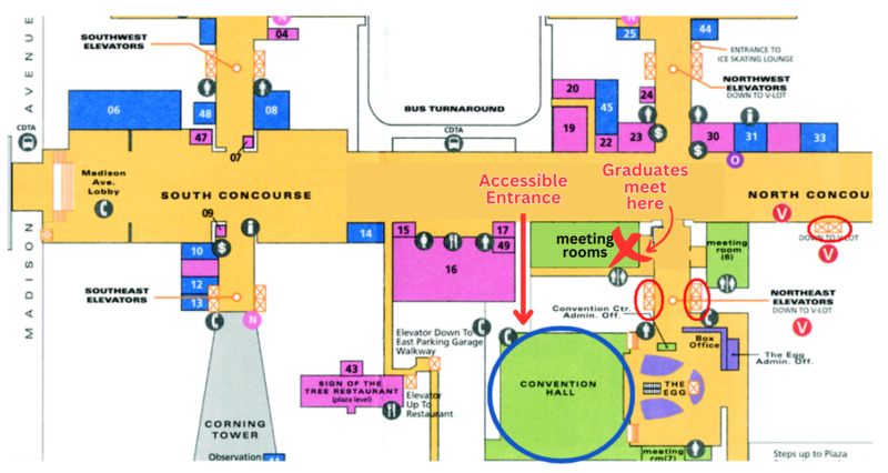 Graduates need to arrive in their caps and gowns. Keep an eye on your tassel – wrap it around the button on the top of your cap a couple of times or it will fall off and disappear on your way to the Convention Center.