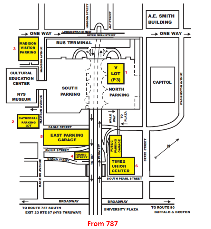 V-Lot is located beneath the Empire State Plaza and accessed through I-787 Empire State Plaza exit. Exit using the I-787 ramp to the Empire State Plaza, and proceed along the traffic loop under the Plaza and bear right for V Lot (P-3).