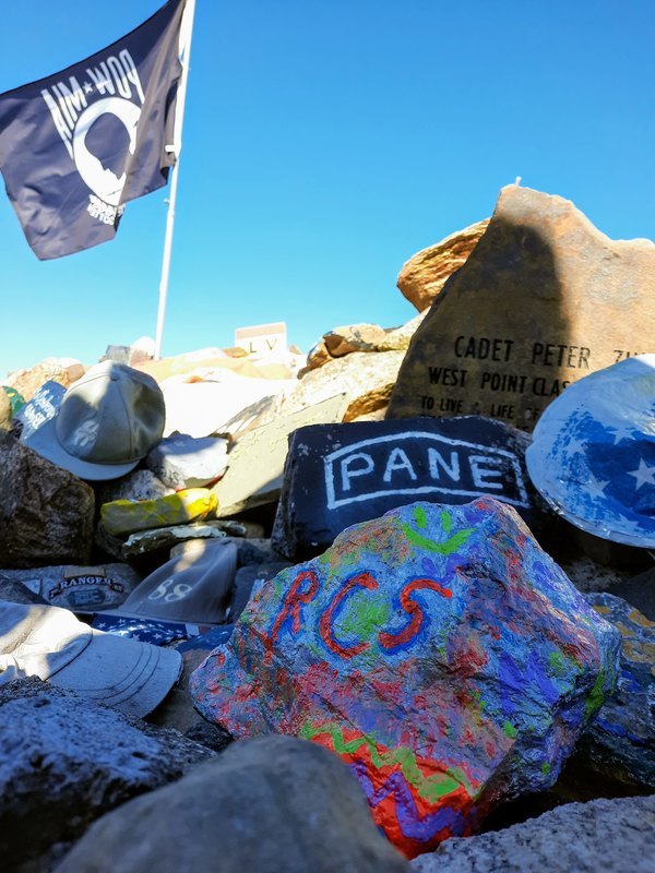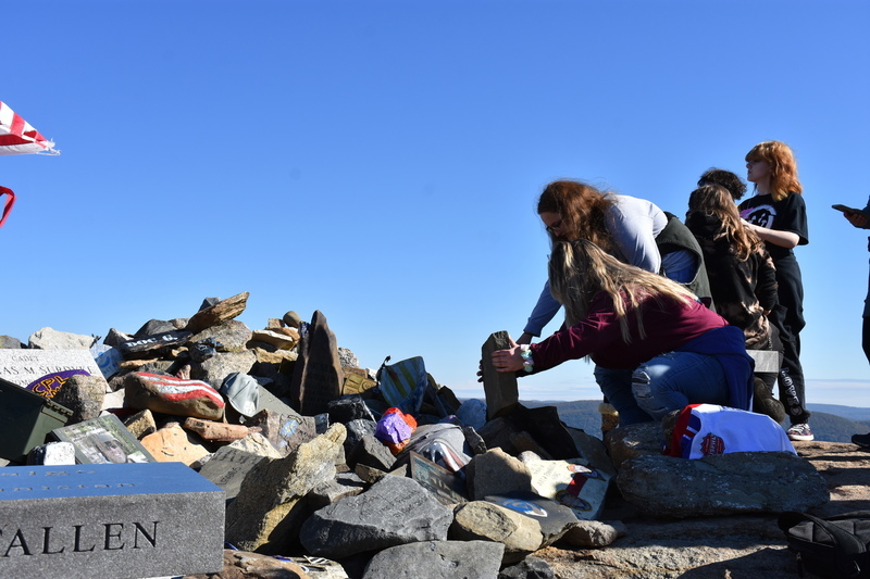 The students were asked at the beginning of their hike to think of a word that is an essential part of teamwork, a key to being a part of the military, and many other jobs. Their answers were nothing short of inspiring; respect, effort, trust, diversity, hope, family, friends, sacrifice, the list goes on and on. Each student then had the opportunity to write their word on one of the rocks carried up by the students. This activity served as a reminder of the lives lost and what can be accomplished as a team.