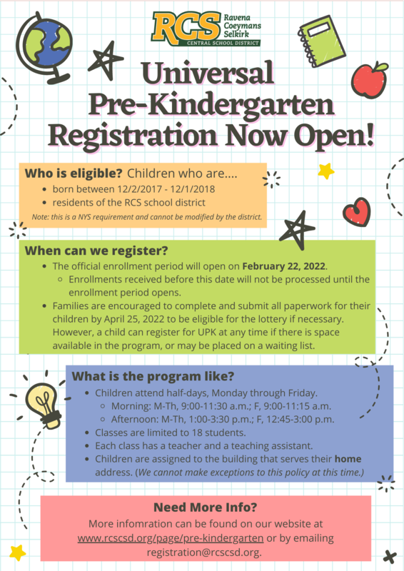 The Ravena-Coeymans-Selkirk Central School District has released important information regarding the Universal Pre-Kindergarten (UPK) Program for the 2022-2023 school year. Open enrollment begins February 22, 2022.
