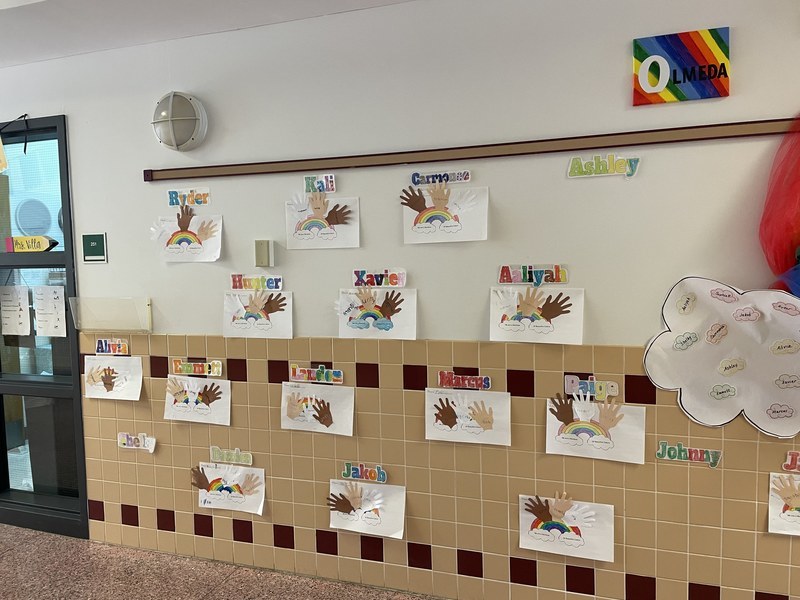 At the beginning of the school year, Pieter B. teachers Ms. Olmeda, Ms. Villa, Ms. Emerick, and Ms. Rice wanted to create an inclusive atmosphere as they united their second and third grade multi-age classrooms. They hung up a beautiful display (see below) that uses the rainbow to represent unity, working together, and becoming a family between the two rooms. The design was completed with each teacher's initials coming together to spell out O.V.E.R the rainbow.