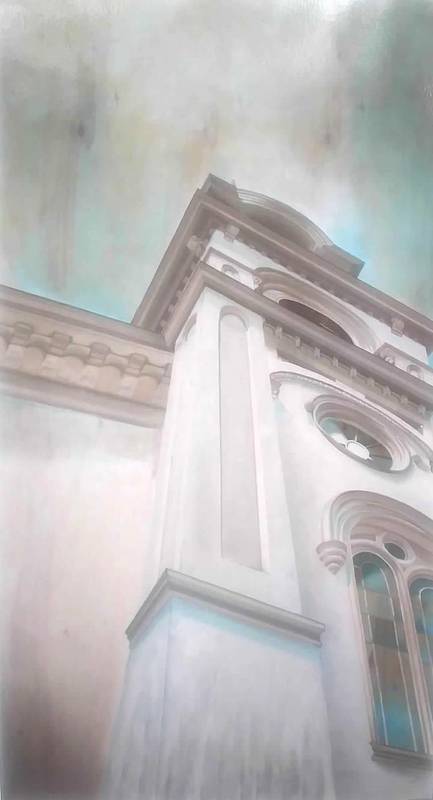 Summary: This painting is titled Steeple in Lee, and it is based on a photograph that Ms. Esmond’s husband took while they were traveling. She loved the perspective and decided to paint it in oils on the top of her coffee table. Once the paint was dry, she put glass over it to protect the painting. In addition to oil painting, Ms. Esmond also enjoys printmaking and costume illustration, and above all painting with her two sons.