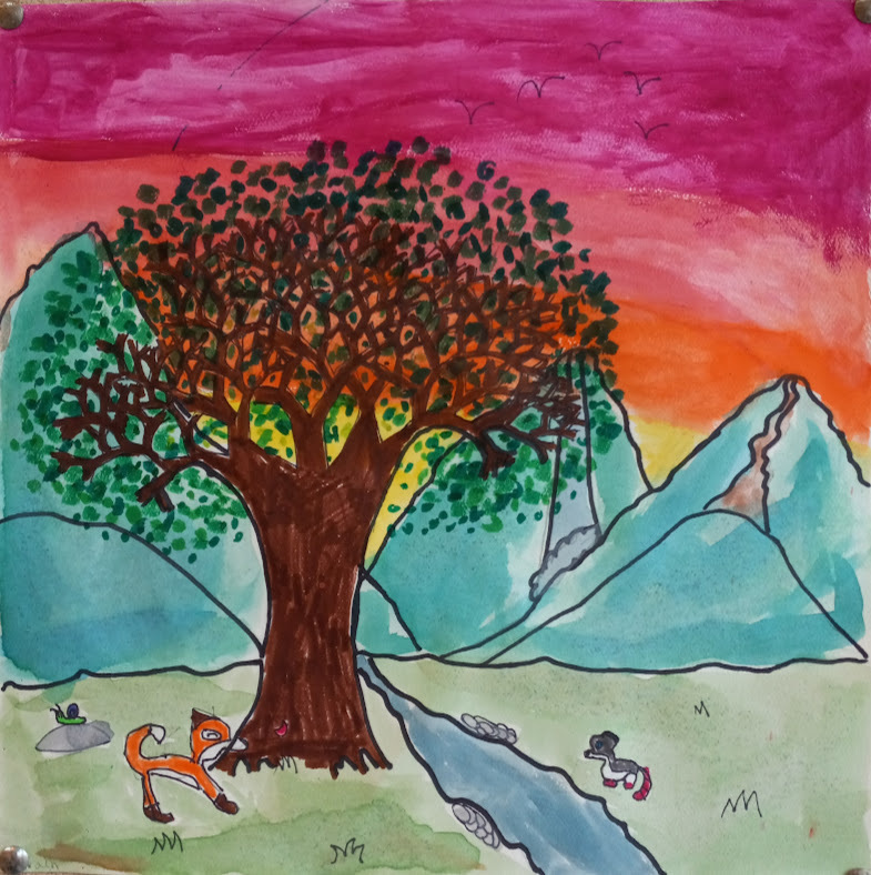 Kendra is a spirited young artist with a flair for creativity. She specializes in drawing woodland creatures, which frequently appear in her art projects. I especially enjoy Kendra’s whimsical rats! This vibrant sunset landscape is the perfect showcase for Kendra’s collection of creatures. Kendra’s recipe for success is abundant talent mixed with hard work and a dose of fun. She is a delight to teach. Great job, Kendra!