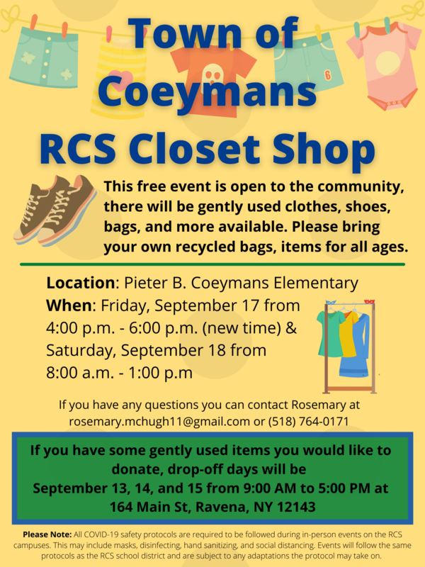 The Town of Coeymans will be holding an RCS Closet Shop event that has free clothing available for our community on Friday, September 17 from 4:00 p.m. to 6:00 p.m. and Saturday, September 18 from 8:00 a.m. to 1:00 p.m.