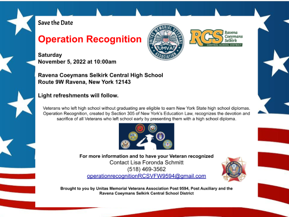 Operation Recognition, created by Section 305 of New York Education Law, recognizes the devotion and sacrifice of all Veterans who left school early by presenting them with a high school diploma. The RCS Central School District and our partnering groups want to take this time to honor, appreciate and celebrate our RCS Veterans’ by presenting them or their surviving families with a diploma from the Ravena-Coeymans-Selkirk Central School District.